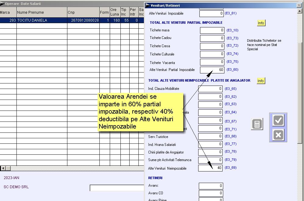 In primul caz 60% din valoarea totala a arendei se complecteaza la “Alte Venituri Partial Impozabile”, iar diferenta de 40% se inregistreaza pe“Alte Venituri Neimpozabile”. Restul datelor sunt specifice calitatii de salariat (incadrare, pontaj, venituri, retineri…etc.) Deci arenda va figura intocmai ca un venit suplimentar pentru acei salariati care sunt in acelasi timp si beneficiari de arenda.