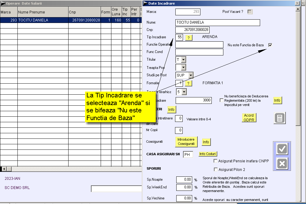 In al doilea caz, beneficiarul de arenda se inregistreaza cu datele personale intocmai ca un salariat nou, insa la Tip Incadrare se selecteaza “Arenda” si NU se ponteaza. Se bifeaza de asemenea optiunea “Nu este functia de Baza”, asa cum se vede in imagine. Mai departe valoarea Arendei se trece in acelasi campuri ca la cazul 1, defalcat pe 60% (partial impozabil) si 40% (neimpozabil) cf. legii, deci intocmai ca in primul caz.